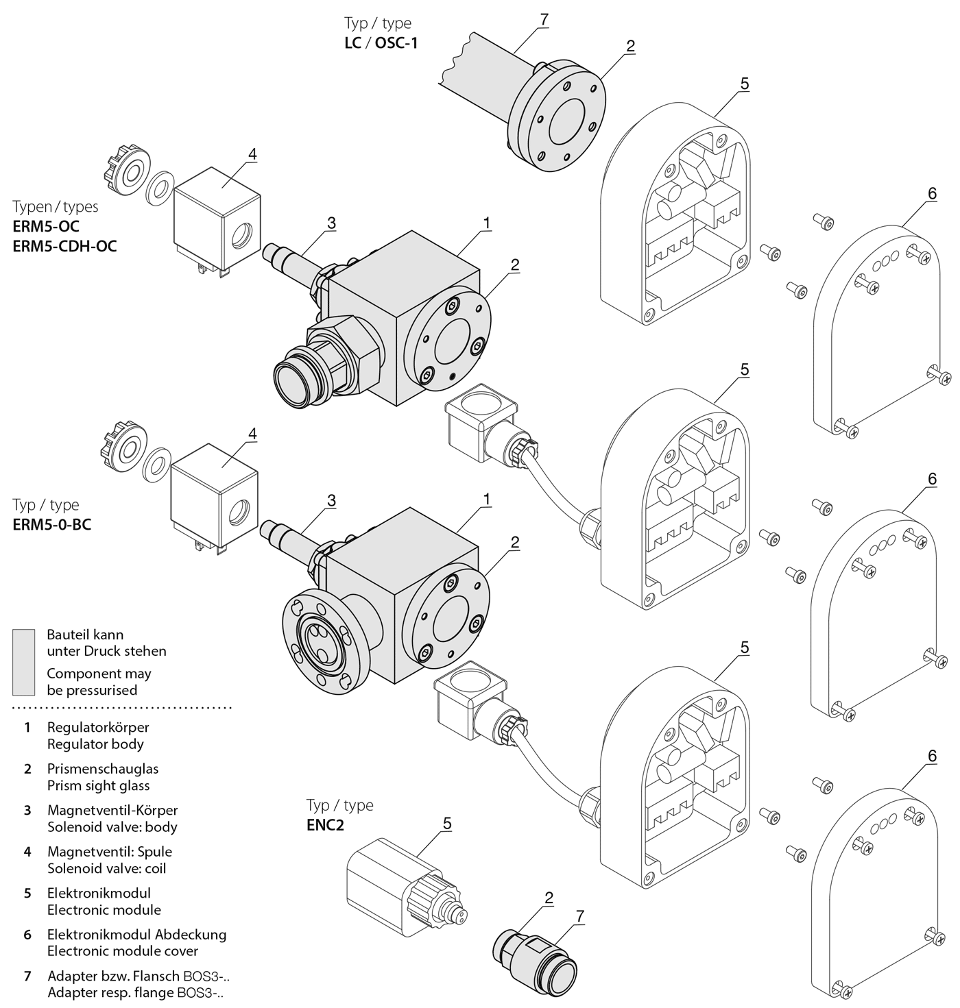 Bitte beachten Sie, dass Komponenten zur Füllstandsregelung und -kontrolle innerhalb einer Kälteanlage auch bei Stillstand unter Druck stehen können. Die hervorgehobenen Baugruppen sind druckbeaufschlagt, das Öffnen ist daher nur im drucklosen Zustand zulässig. Bei Betriebsdruck demontierbare Bauteile sind die Magnetventilspule (4) und das Elektronikmodul (5).